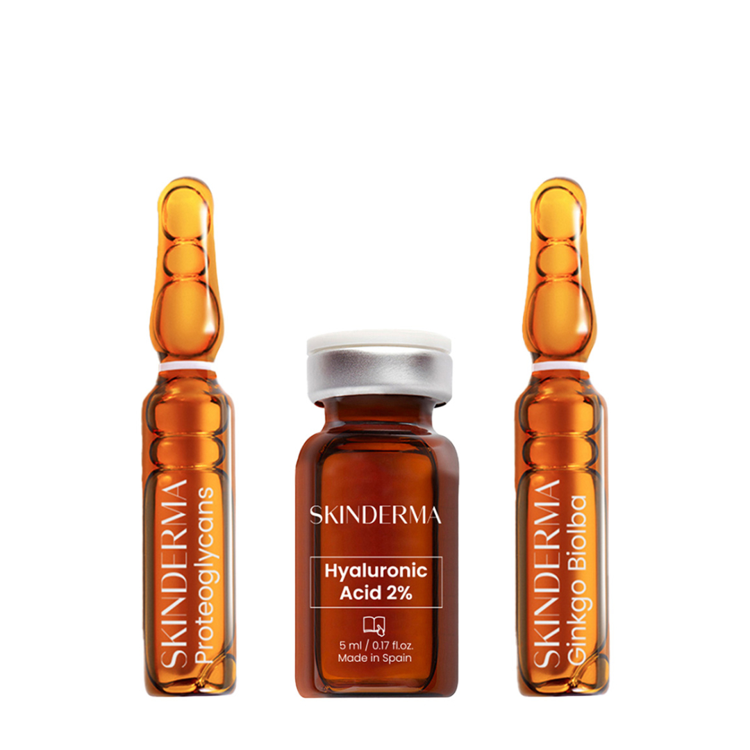 Componentele naturale din fiola ginko biloba cresc circulatia sanguina, prin extinderea capilarelor mici si intaresc peretii vaselor de sange. Fiola antirid cu proteoglicani asigura drenarea retentiei de apa, iar acidul hialuronic densifica tesutul cutanat al zonei sensibile din jurul ochilor.