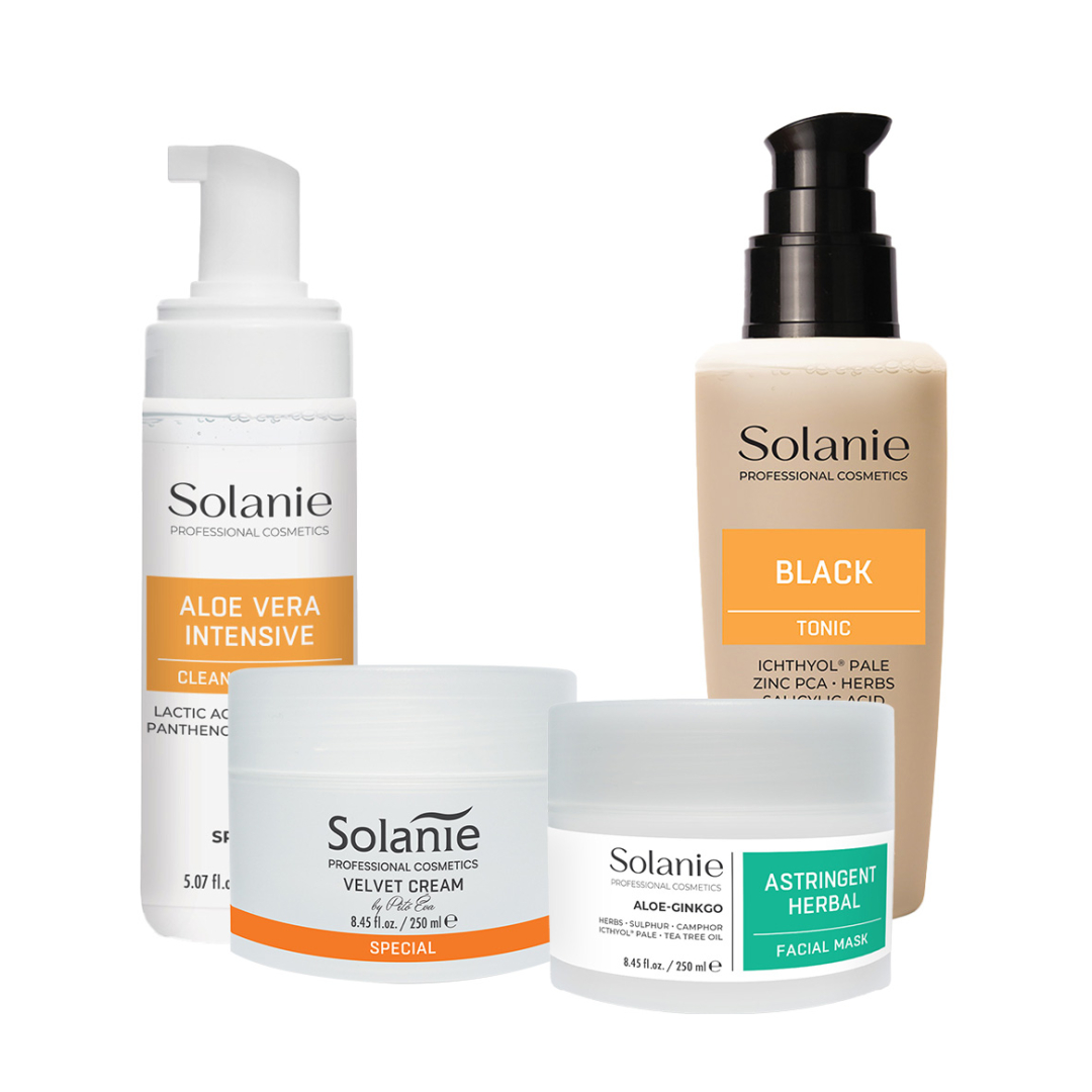 Masca de fata cu sulf Solanie se recomanda pentru tratarea tenurilor uleioase, seboreice cu matreata. Sulful coloidal tempereaza activitatea glandelor sebacee. Camforul si uleiul de arbore de ceai are efect calmant, antiseptic si cicatrizant. Contine extracte de aloe, ginkgo, coada calului (atenueaza hemoragiile si are efect astringent), trei-frati-patati (reduce dimensiunea porilor), ulei de luminita (antidot eficient al acneei), ichtiol, vitamina E, F, pantenol, alantoina si oxid de zinc (efect calmant si de uscare).